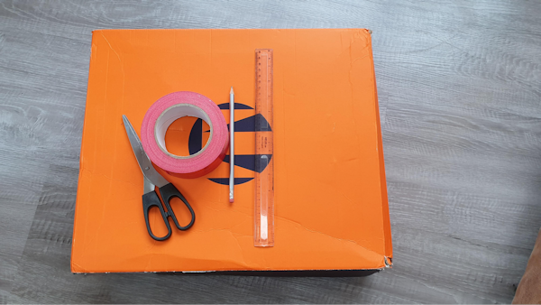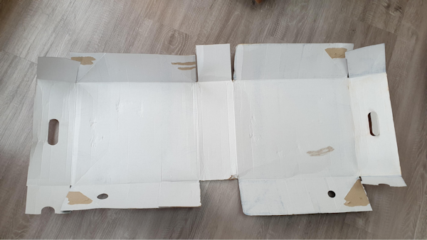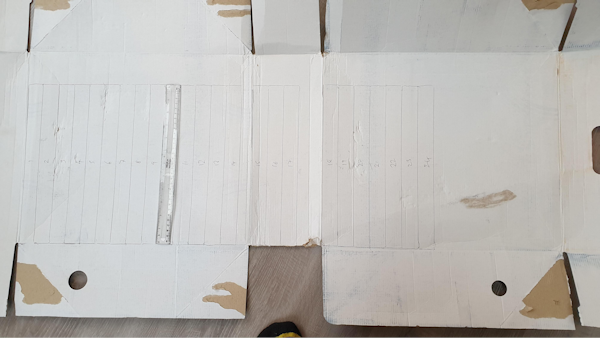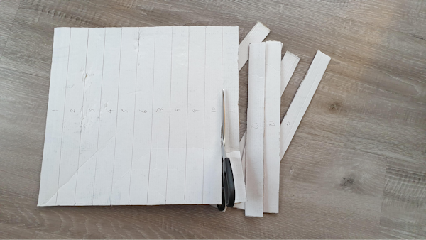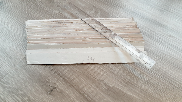 - Deconstruct the box and layout (if corrugated, for extra strength make sure internal corrugated ribs run along the length of the strips to be cut)