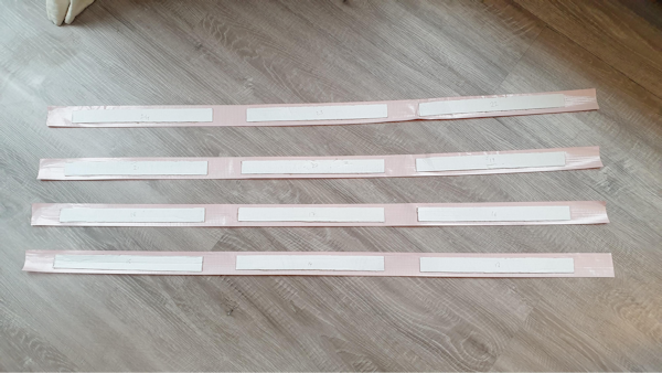 - I carefully lifted them both using their cardboard strips and positioned them so there was approximately 1cm gaps between the cardboard strips and the new tape to be stuck down.